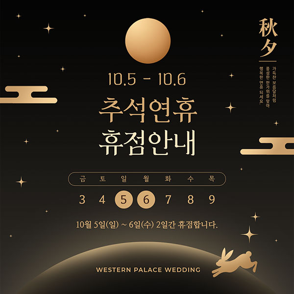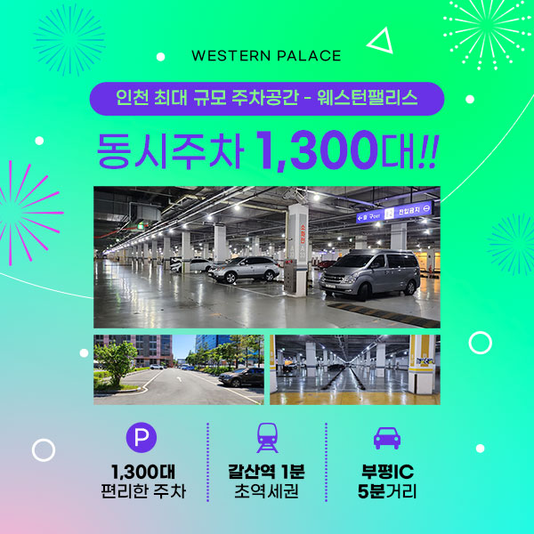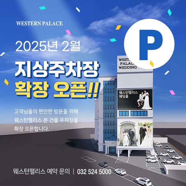 2026년 설 연휴기간 영업 안내 웨스턴팰리스에 보내주신 관심과 성원에 깊은 감사를 드립니다. 어느덧 설 명절이 다가왔습니다. 따뜻한 정과 사랑이 가득한 행복한 설 연휴 보내시길 바라며, 안전하고 편안한 귀성길 되시기 바랍니다.… 2026.01.27 MORE 2025년 추석 연휴 기간 영업 안내 웨스턴팰리스웨딩은 2025년 추석 연휴 기간 중 10월 5일(일)과 10월 6일(월), 2일간 휴점하며 전일 정상 영업합니다. 풍요로운 한가위 보내세요~… 2025.09.21 MORE 동시 주차 1,300대 인천 최대 규모의 주차 공간 웨스턴팰리스는 동시 주차 1,300대 인천 최대 규모의 주차 공간을 보유하여 주차걱정없이 편리하게 주차하실 수 있습니다. 또한, 갈산역 도보 1분, 부평IC에서 5분거리에 위치하여 대중교통 이용 및 자가용 이용시 빠르게 웨딩홀로 오실 수 있습니다.… 2025.04.26 MORE 2025년 2월, 지상주차장 확장 오픈 2025년 2월, 웨스턴팰리스 지상 주차장을 확장 오픈합니다. 고객님들의 보다 편안한 방문을 위해 본 건물 지상 주차장을 확장합니다.… 2024.12.07 MORE 1